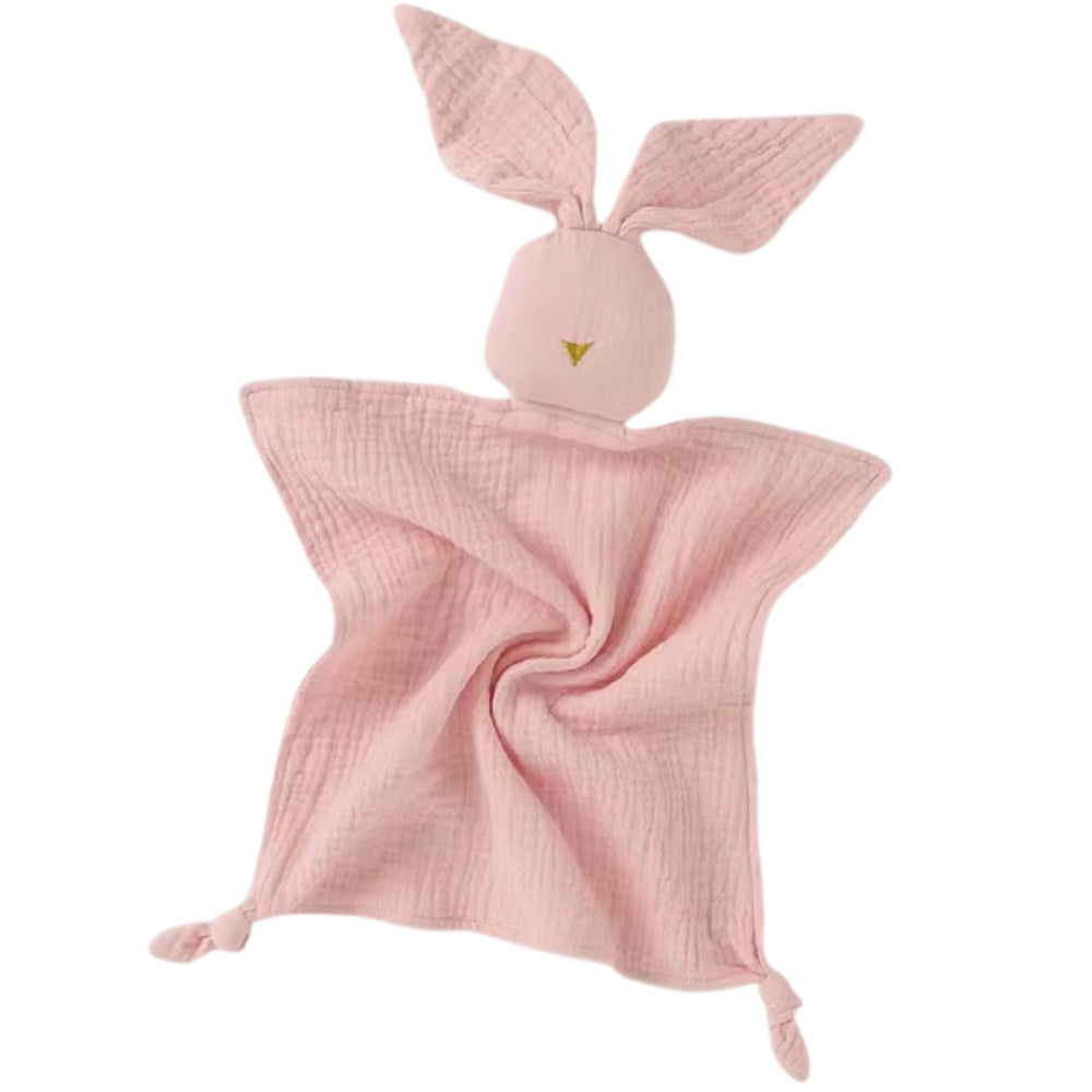 Het knuffeldoekje heeft de vorm van een konijn met een lief kopje en grote konijnenoren.