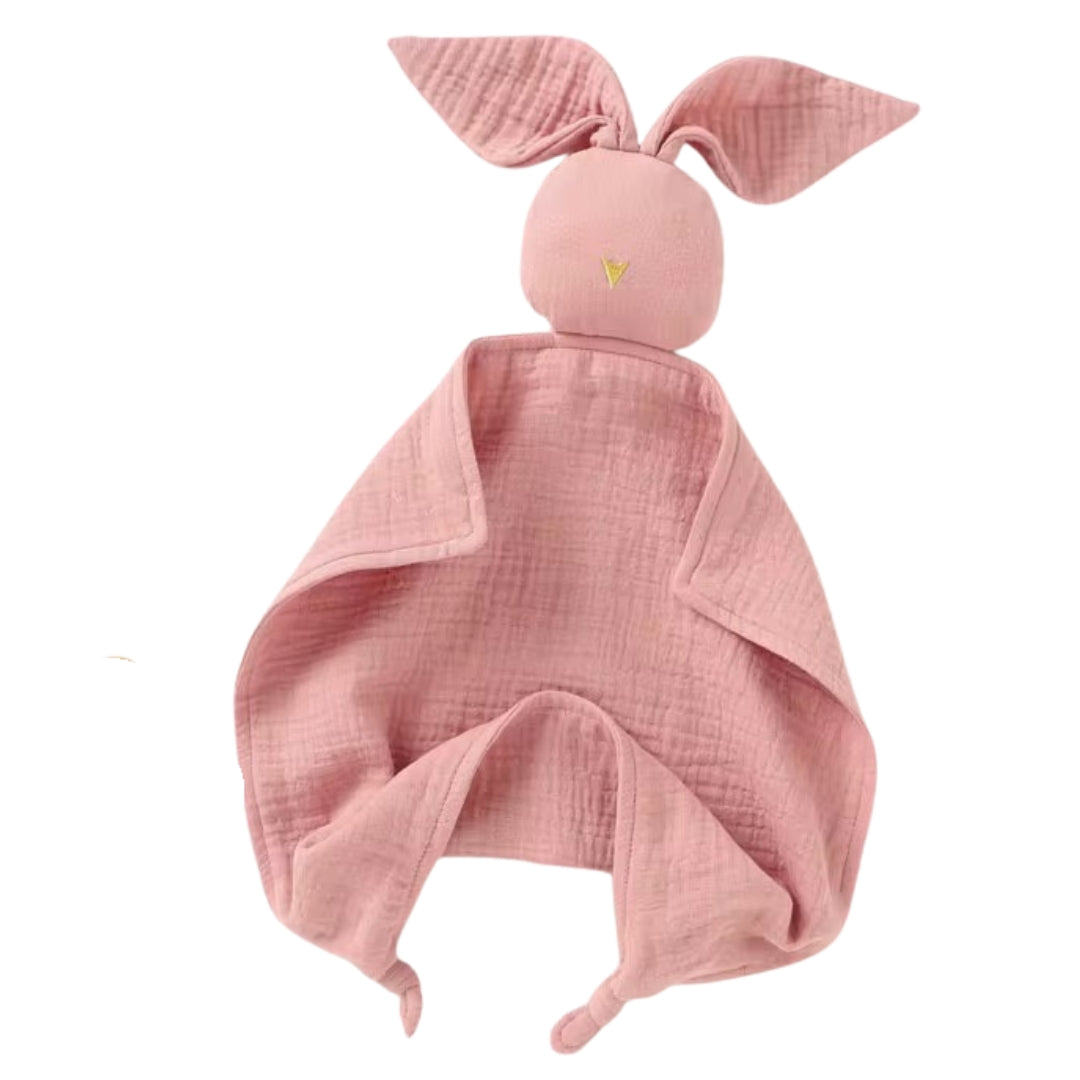 Het knuffeldoekje heeft de vorm van een konijn met een lief kopje en grote konijnenoren.